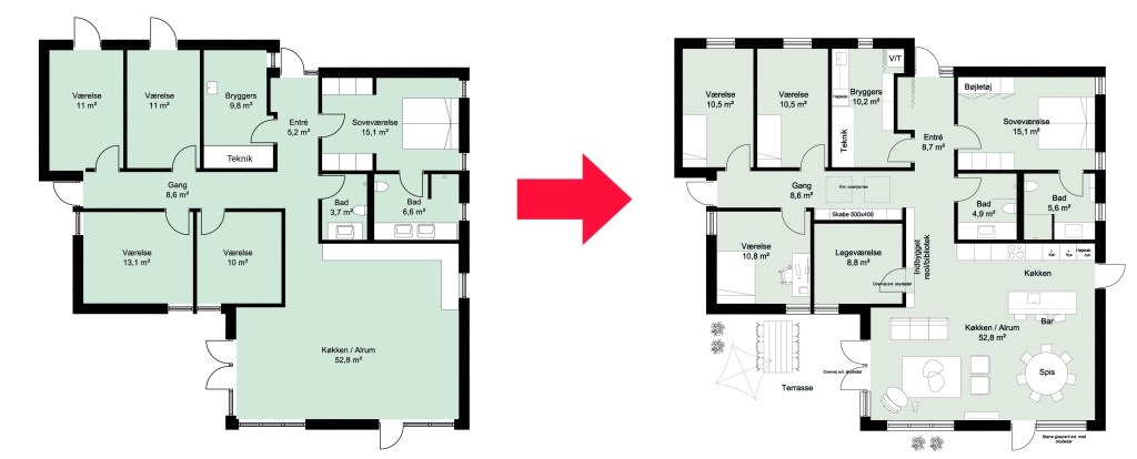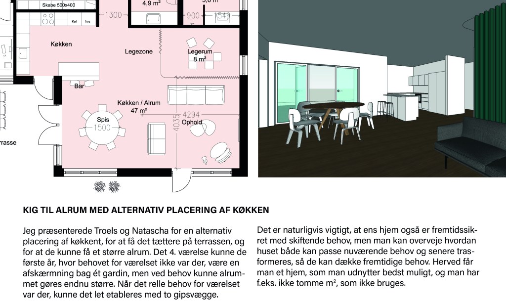 Alrummets sydvestlige hjørne med adgang til den store terrasse var, i mine øjne, det mest oplagte sted til køkkenet, fordi der dermed var større chance for, at familien ville bruge terrassen til at spise på. Indretningen påvirker nemlig vores adfærd, og der skal ikke større afstande eller at noget er upraktisk, før man undlader at gøre noget. Som f.eks. at tage sin frokost eller aftensmad med uden for. Jeg viste derfor Troels og Natascha indretningsforslag med køkkenet placeret dér og så ophold/stue i husets ”mørkeste” område. Jeg viste dem også hvordan køkkenet kunne placeres i det lille værelse, så de kunne få et større alrum og selv til/fravælge vægge til et 4. værelse, når behovet opstod. Men parret fastholdt køkkenets placering, og vi havde en god snak omkring fordele og ulemper. I sådan en proces har jeg stor respekt for de valg, som folk træffer, og de mange forslag jeg er kommet med, har blot bekræftet dem i deres valg. Parret har således kunne træffe beslutninger på en mere oplyst baggrund.