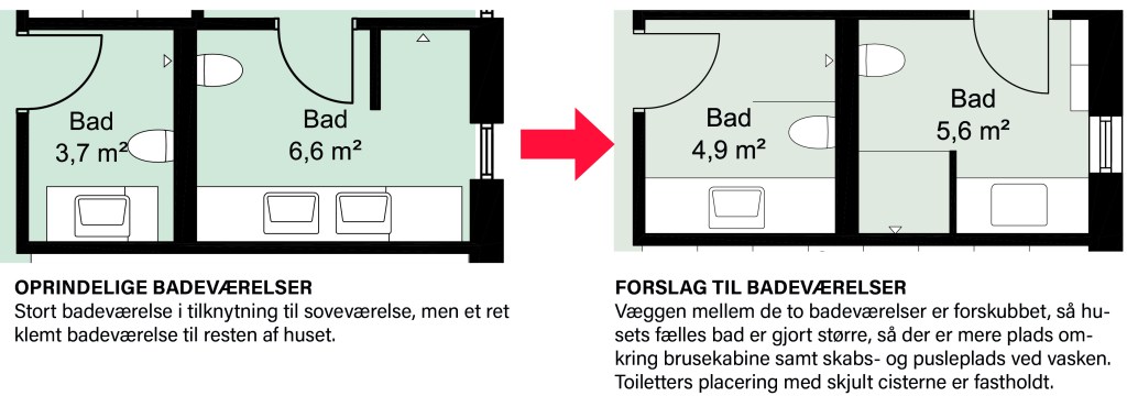 Med tankerne ledt hen på et well ness rum, og at man kan stå ved siden af sin partner og børste tænder, kunne jeg sagtens forstå, at det var tiltalende med et stort badeværelse i tilknytning til soveværelset. Men med tre børn og én som stadig skal pusles, spurgte jeg derfor Troels og Natascha om de var sikre på fordelingen af m2 mellem de to badeværelser. For var det ikke bedre at gøre ”børnebadet” større, så de havde plads til at få alle børn i bad på samme tid? Og plads til mere opbevaring og til at de alle 5 kunne være der – på samme tid. For parret gav det meget mere mening at reducere voksenbadet og gøre børnebadet større.