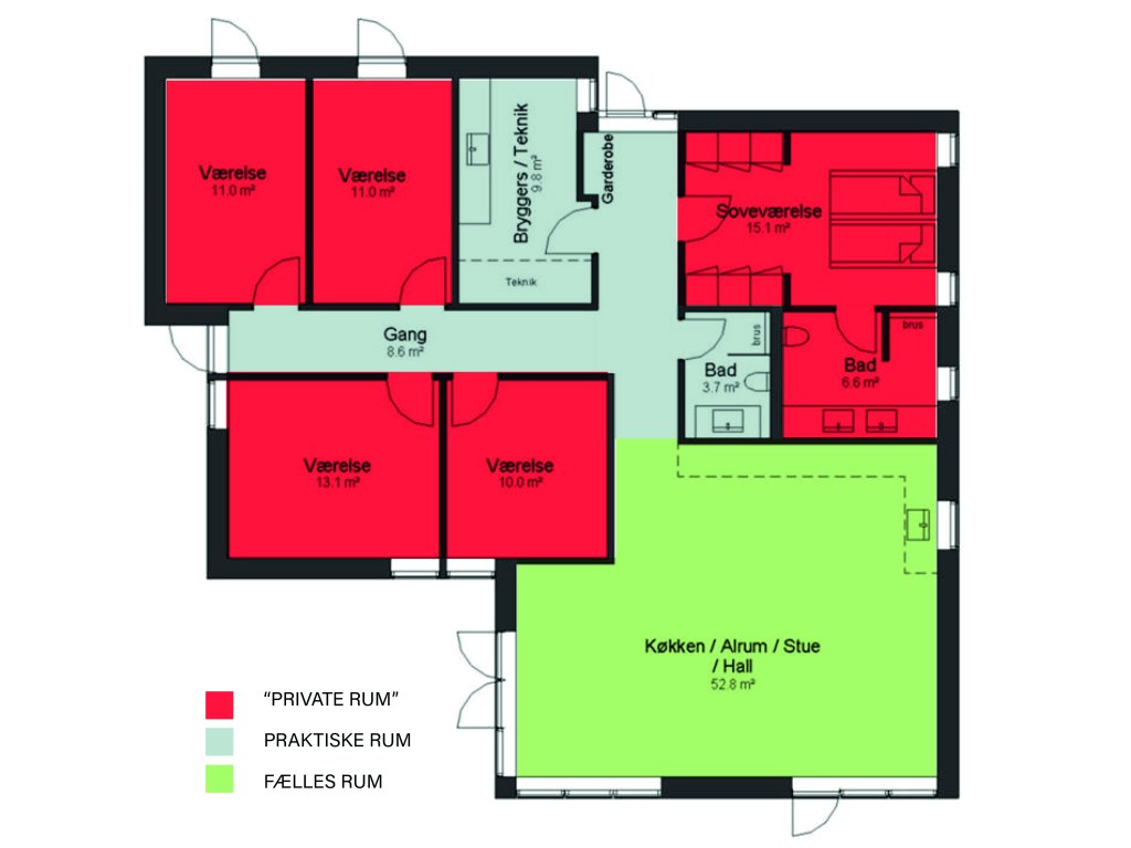 Den første analyse jeg lavede, var et simpelt diagram over ”private” rum, praktiske rum og fælles rum. Her tegnede der sig et billede af, at der faktisk lå rigtig mange m2 i ”private” og praktiske rum, som ville stå tomme det meste af dagen – særligt mens børnene er små. Der lå 70 m2 i ”private” rum, mens fællesrum kun talte 45 m2.