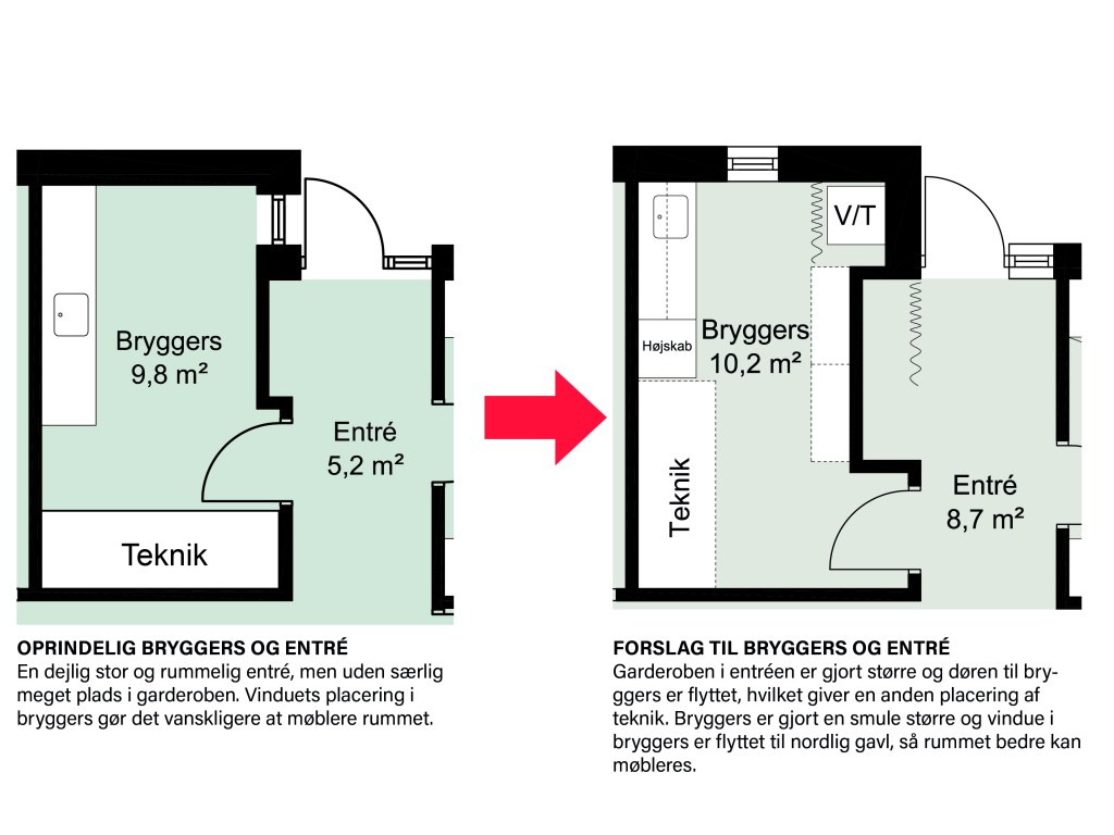 Entréen var i den oprindelige plan stor og rummelig, men der var ikke meget plads til overtøj, tasker, sko osv. Når man er en børnefamilie med 3 børn, er det bare mere praktisk, at alle kan komme af med deres overtøj mv. lige inden for døren. Vi gjorde derfor garderobenichen større og dybere. I stedet for at placere skabe, som kan være svære at udnytte, anbefalede jeg familien at finde en anden form for opbevaring og skjule det bag et smukt gardin. Udover at gardinet vil skabe en varm stemning til entréen, vil det også forbedre akustikken.