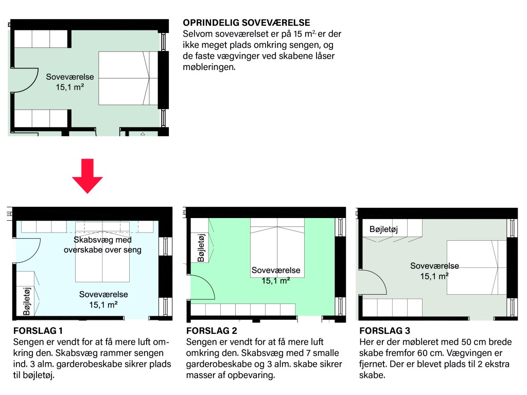 Selvom soveværelset er på 15 m2, var der i den oprindelig møblering ikke meget plads omkring sengen. Garderobeskabene blev afsluttet med fast vægvinge, som ville låse for en anden møblering. Jeg viste derfor flere alternativer til hvordan de stadig kunne få masser af skabsplads, men med mere luft omkring sengen.