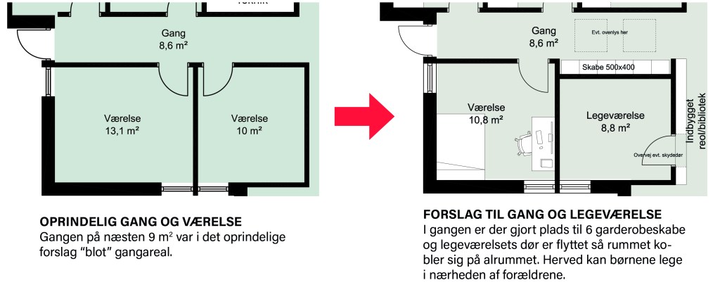 Gangen, som fordelte til de 4 værelser, var næsten 9 m2, hvilket svarer til et helt værelse, men den tjente ikke andre funktioner end gangareal. Ved at skubbe til væggen ind til et af værelserne blev der lige pludselig plads til 6 garderobeskabe, hvor al børnenes tøj kan være. Det er både lettere at finde tøj til børnene i hverdagen, men også lettere at lægge tøj på plads, og det frigiver en masse plads på værelserne.